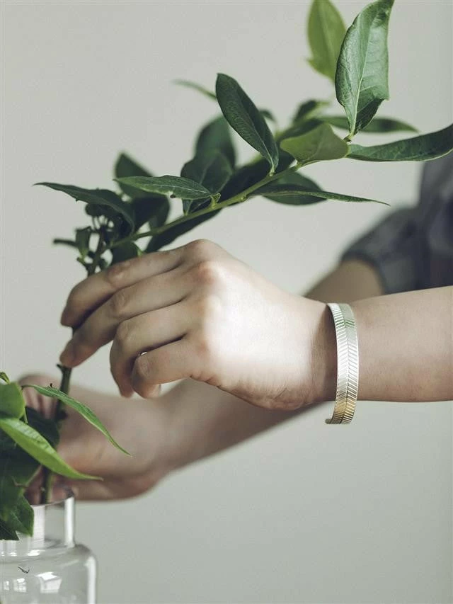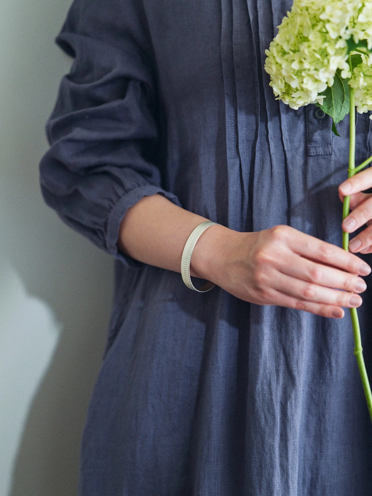 A bangle-shaped bracelet with a herringbone pattern throughout and a silver-plated brass finish.