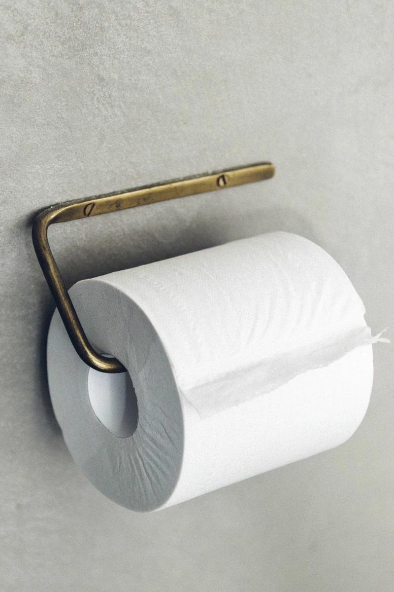 Simple, hand-made toilet paper holder in warm, antiqued brass.