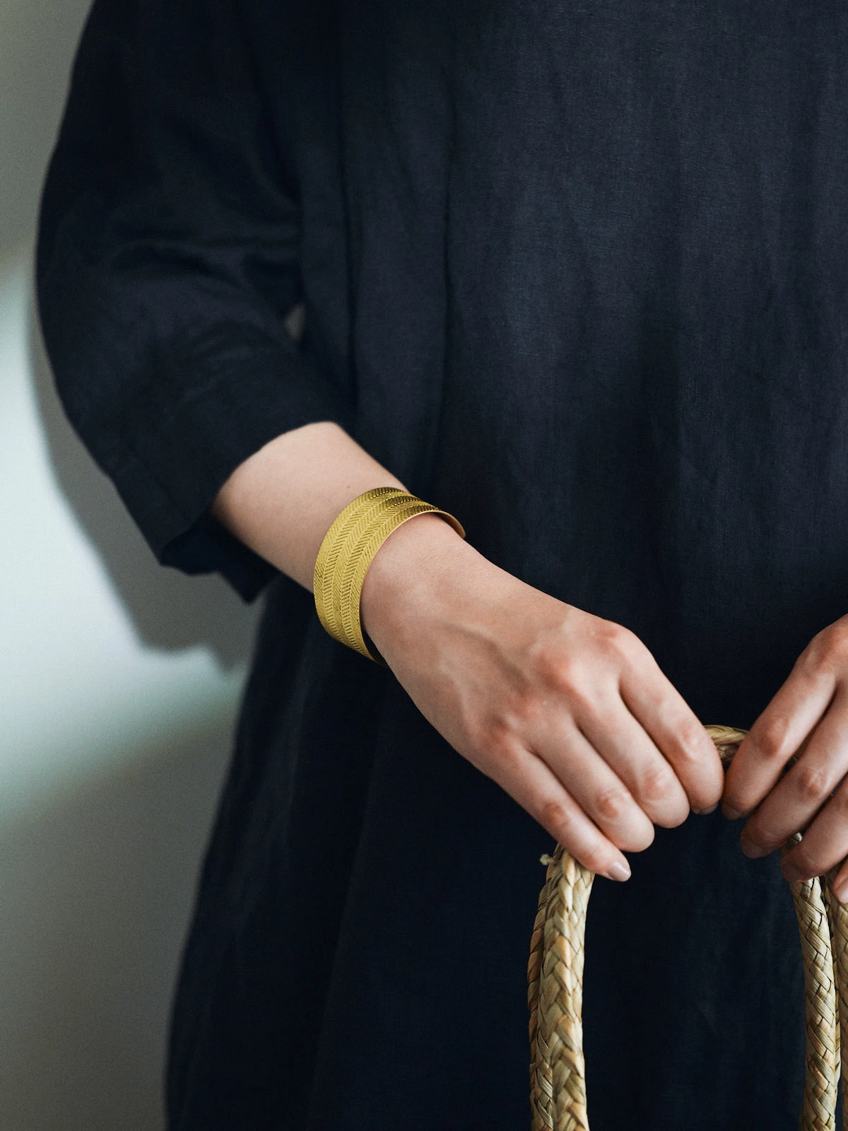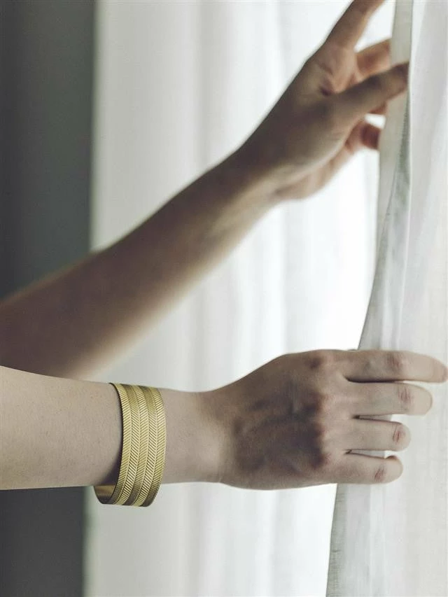 A bangle-shaped Brass bracelet with a herringbone pattern throughout. The wide type has such a lovely presence and it will make a lovely accent for styling, for sure! For both women and men.