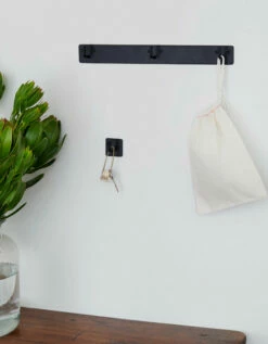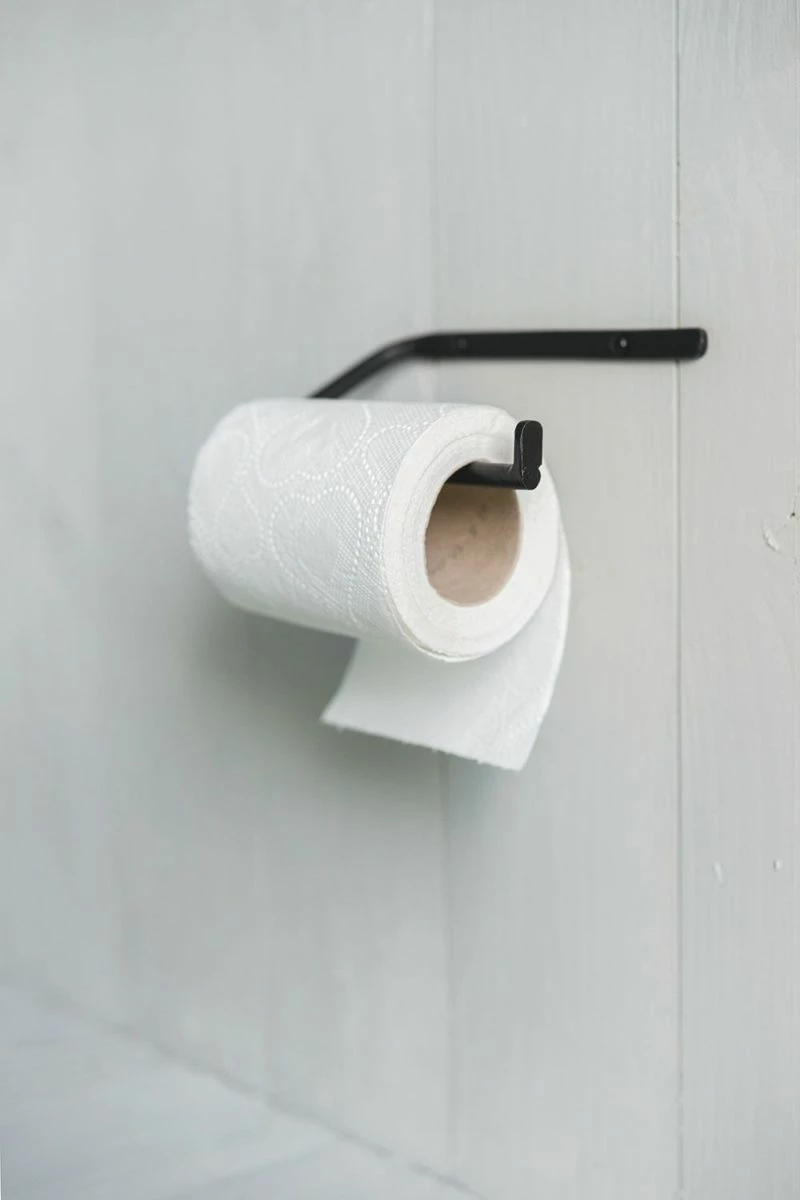 Simple, hand-wrought toilet paper holder in black iron.