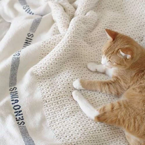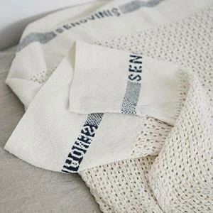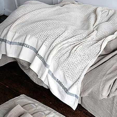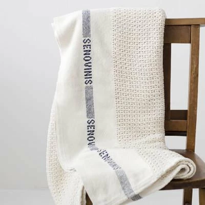 Soft and cosy cotton blanket by Japanese designer Yumiko Sekine. Loose honeycomb weave and large border with a navy blue stripe. Simple and luxurious, it is made of very soft, unbleached cotton: a pure pleasure as a throw on the bed or to relax on the sofa with a good book and a cup of tea…