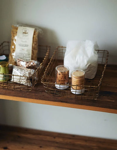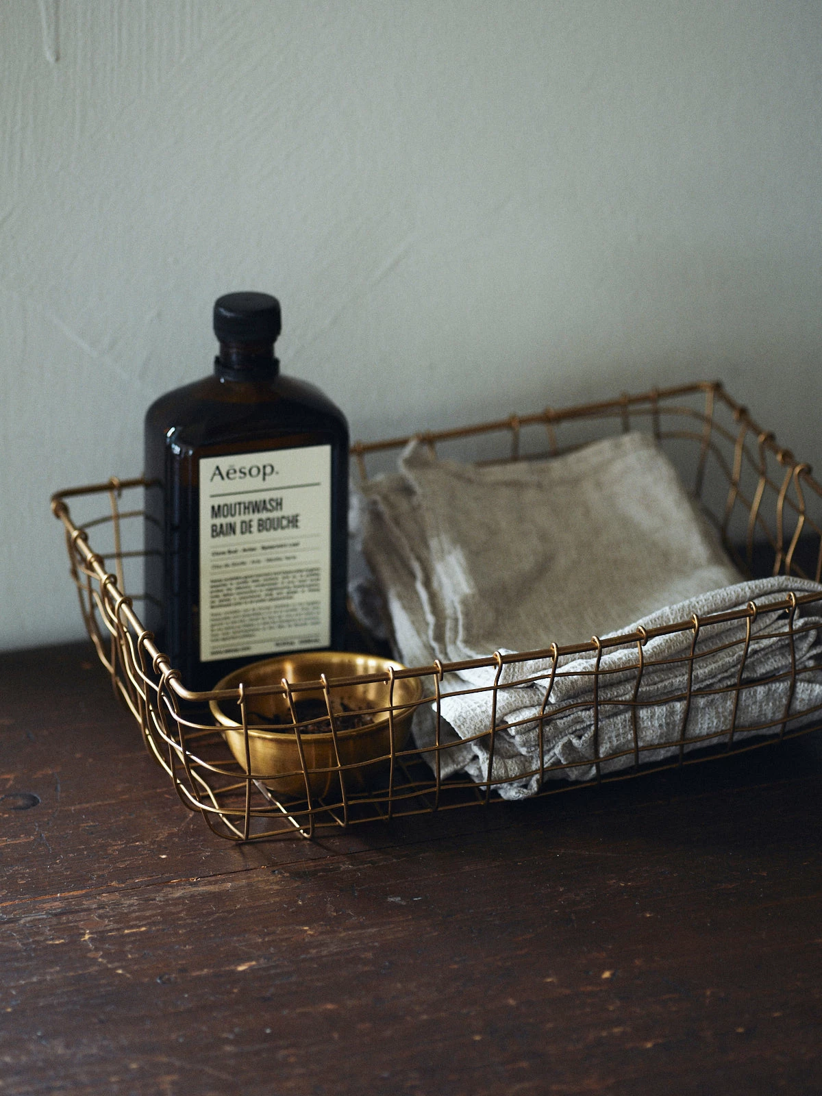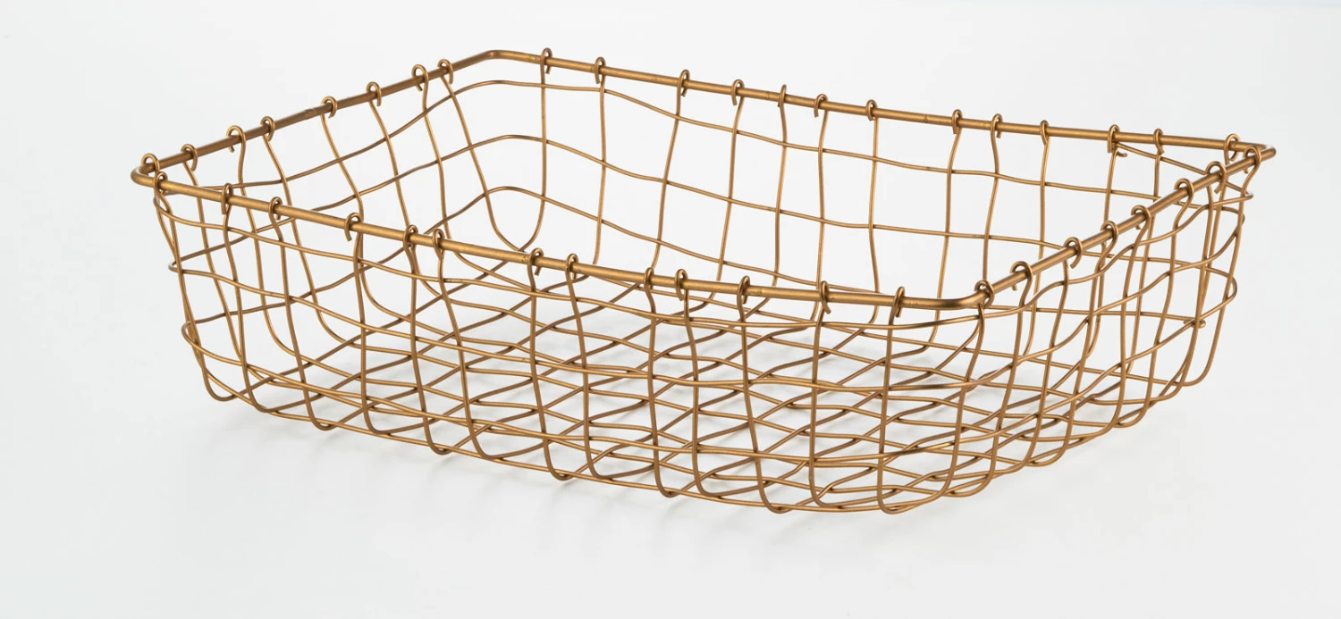 A basket made of brass wire. This shallow type of basket is useful for storing folded cloth and towels. You can use it like a drawer by arranging it on a shelf too.