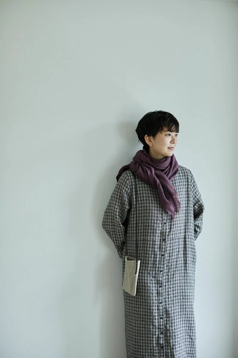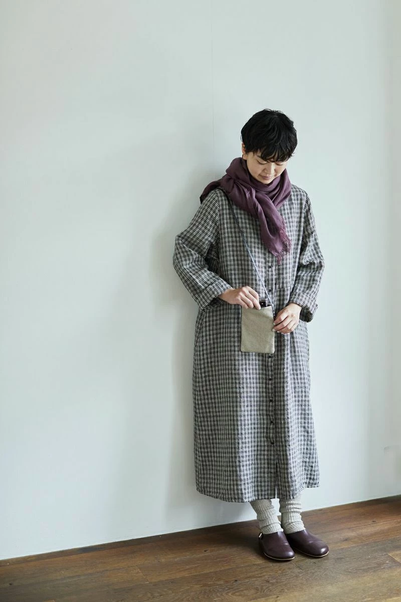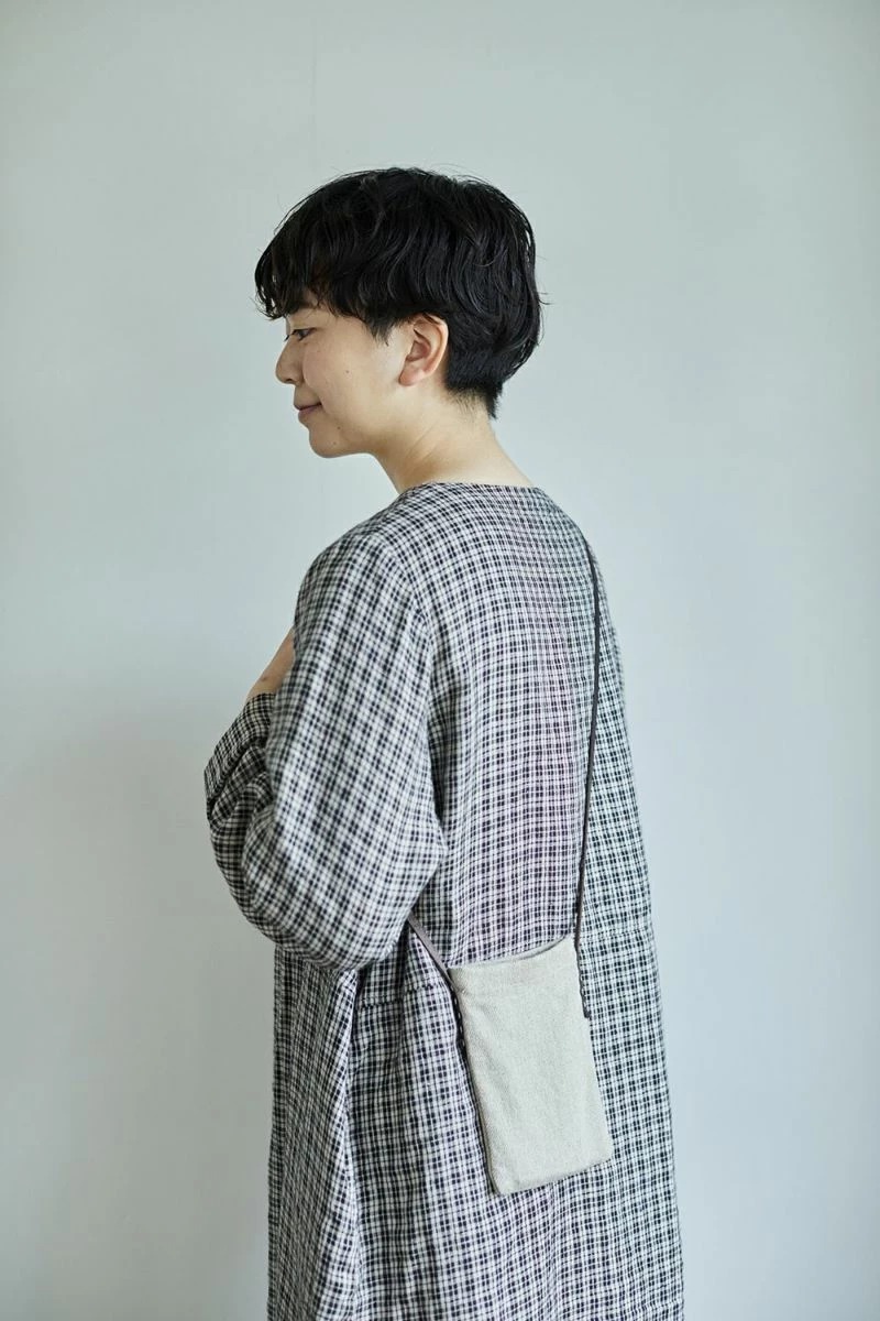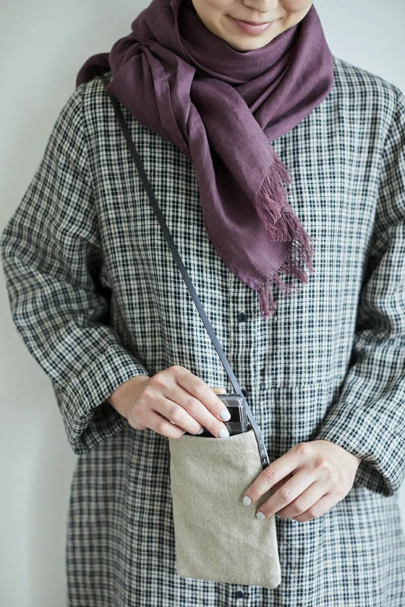 This mini shoulder bag is made of thick, coarse linen fabric. It has a slim and simple design with no gussets. It is just the right size to carry a smartphone or cards, so it can be used when you want to go out lightly or as a point of reference for a simple outfit.