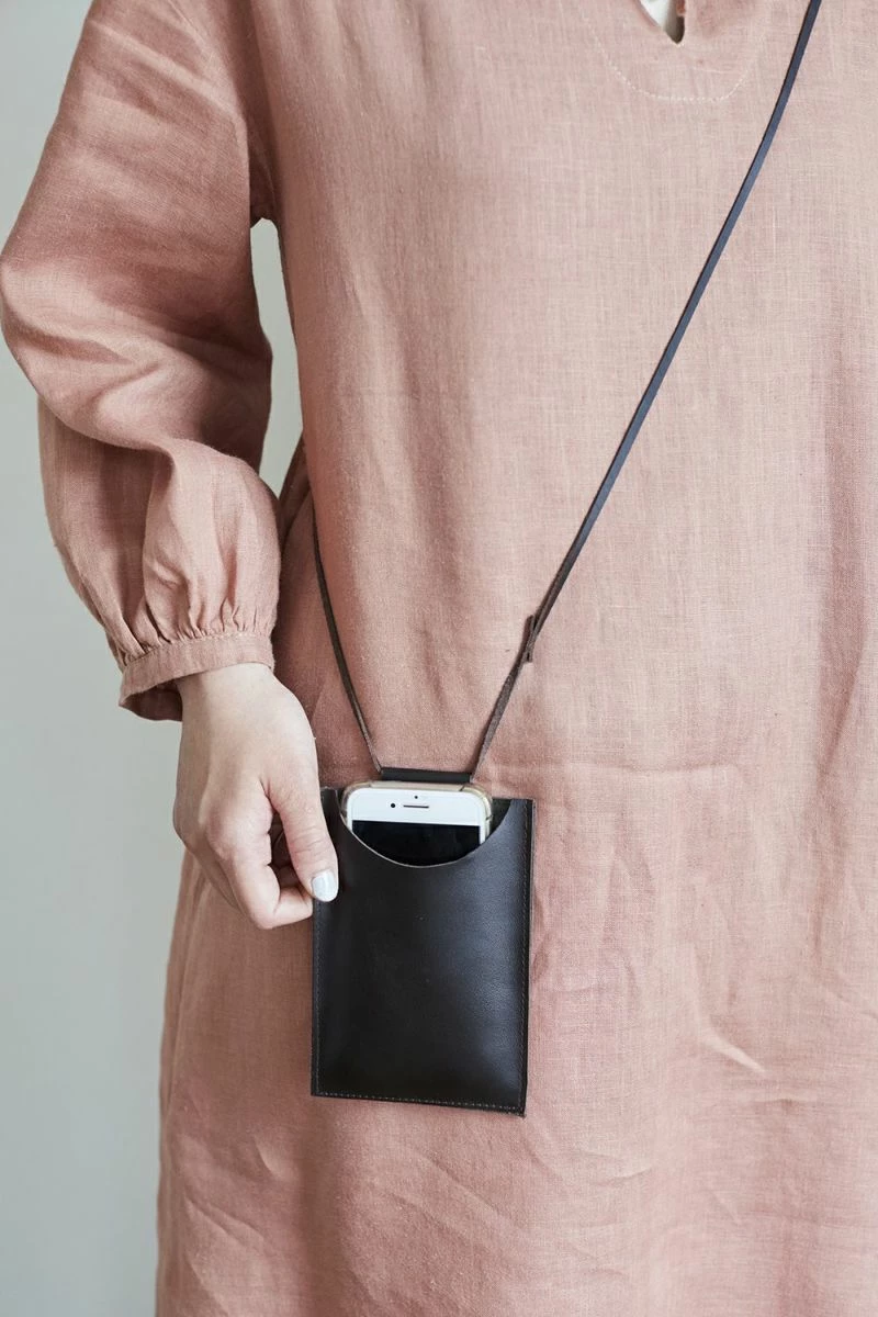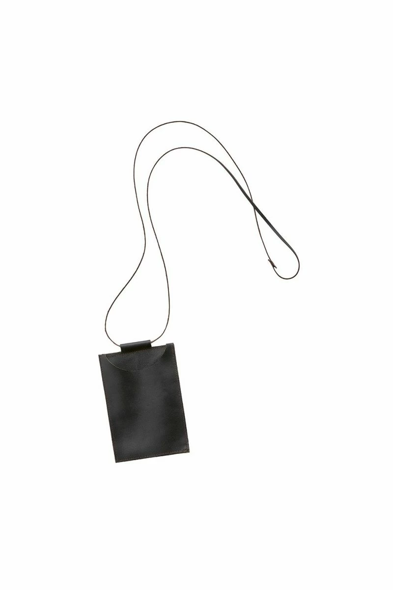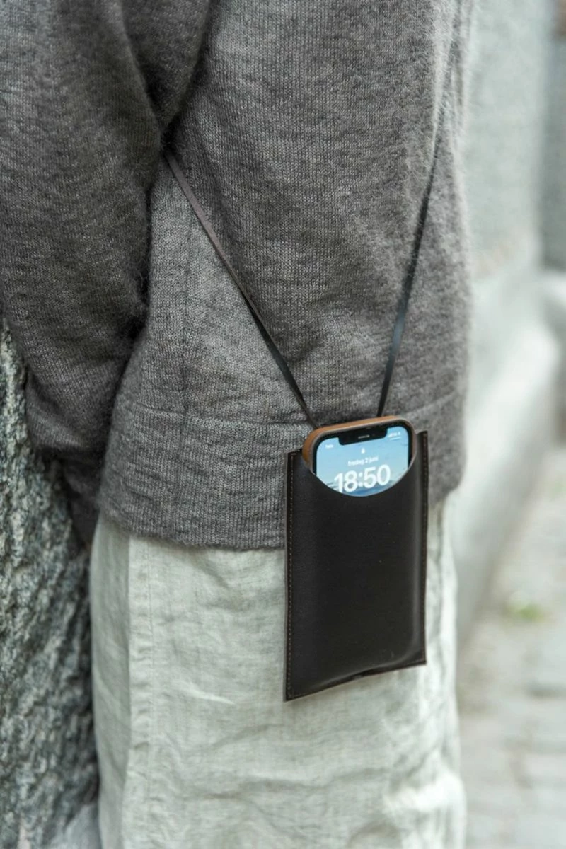 Smartphone holder made of dark brown leather with a matte sheen. It has a slim and simple design with no gussets. It can be used when you want to go out lightly or as a point of reference for a simple outfit.
