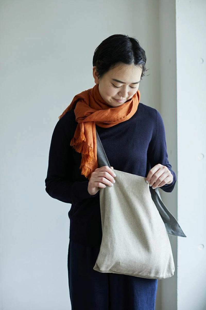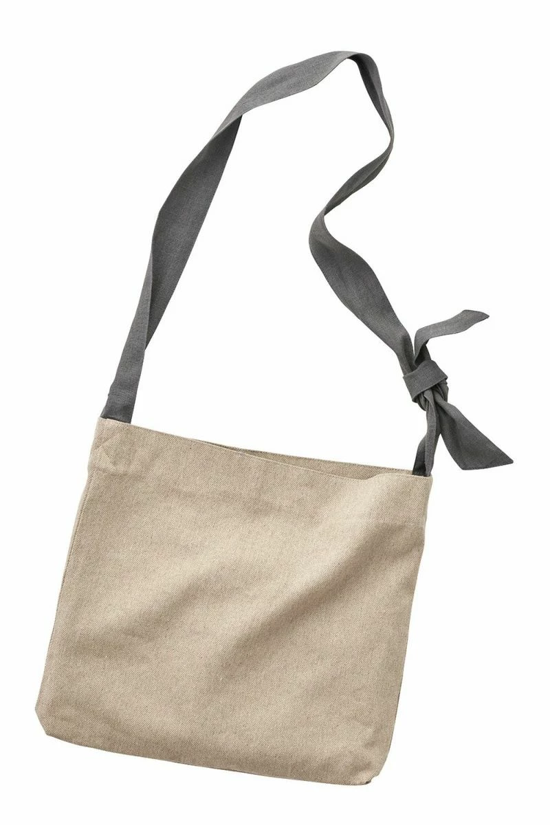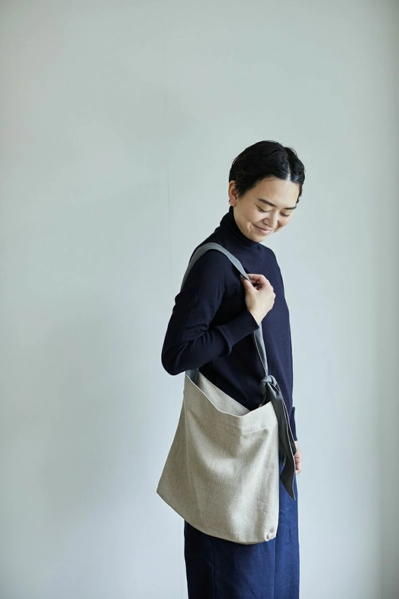 This shoulder bag is made of thick, coarse linen fabric. The shoulder strap, which features a gray color scheme, can be tied at the desired length, and the ribbon can be used either diagonally or on the shoulder, depending on your preference.